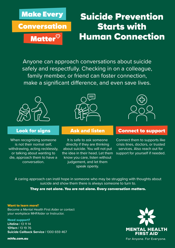 Print and display this poster where it will be seen –in staff rooms, meeting spaces, or internal communications – to help reduce stigma of suicide.