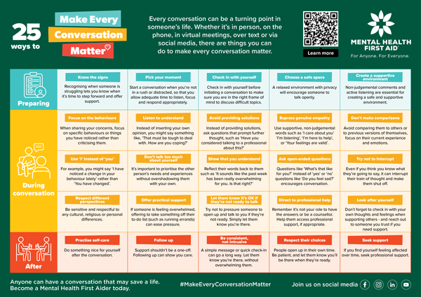 Download our free 25 ways to make every conversation matter resource with tips on how to have open and non-judgemental conversations about mental health.